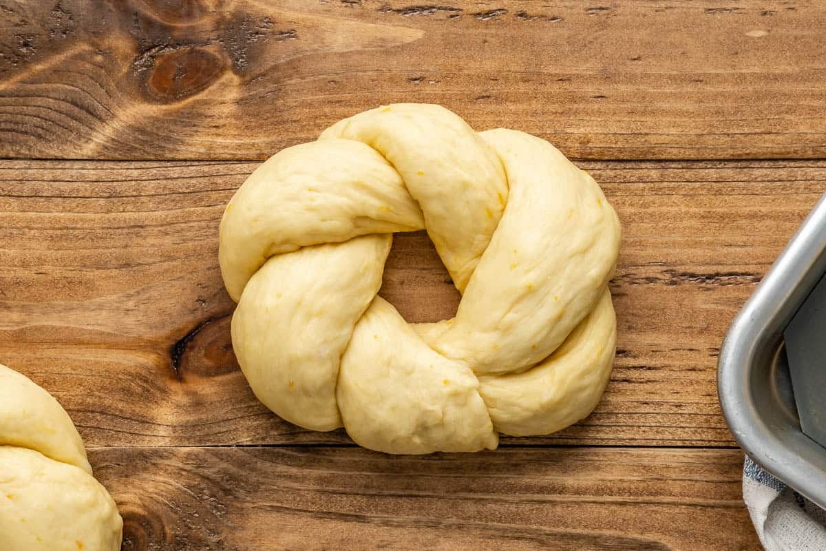 - Assemble the loaves: Line two sheet pans with parchment paper. Use your palms to roll out each piece of dough into a 12-inch rope. Pinch two ropes together at the ends and twist them several times. Pinch the ends together so the twisted rope forms a wreath and tuck the ends underneath. Repeat with the remaining ropes of dough.