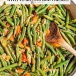 - Simmer. Turn the heat to medium-low and cover the pan with a lid. Simmer for about 25 minutes, checking and stirring occasionally, until the green beans and tomatoes have both softened, released their liquid, and created a delicious pan sauce.