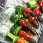 These easy Greek salad skewers turn a traditional recipe into a colorful party appetizer. Think of it as Greek salad on a stick, drizzled with a zesty vinaigrette!