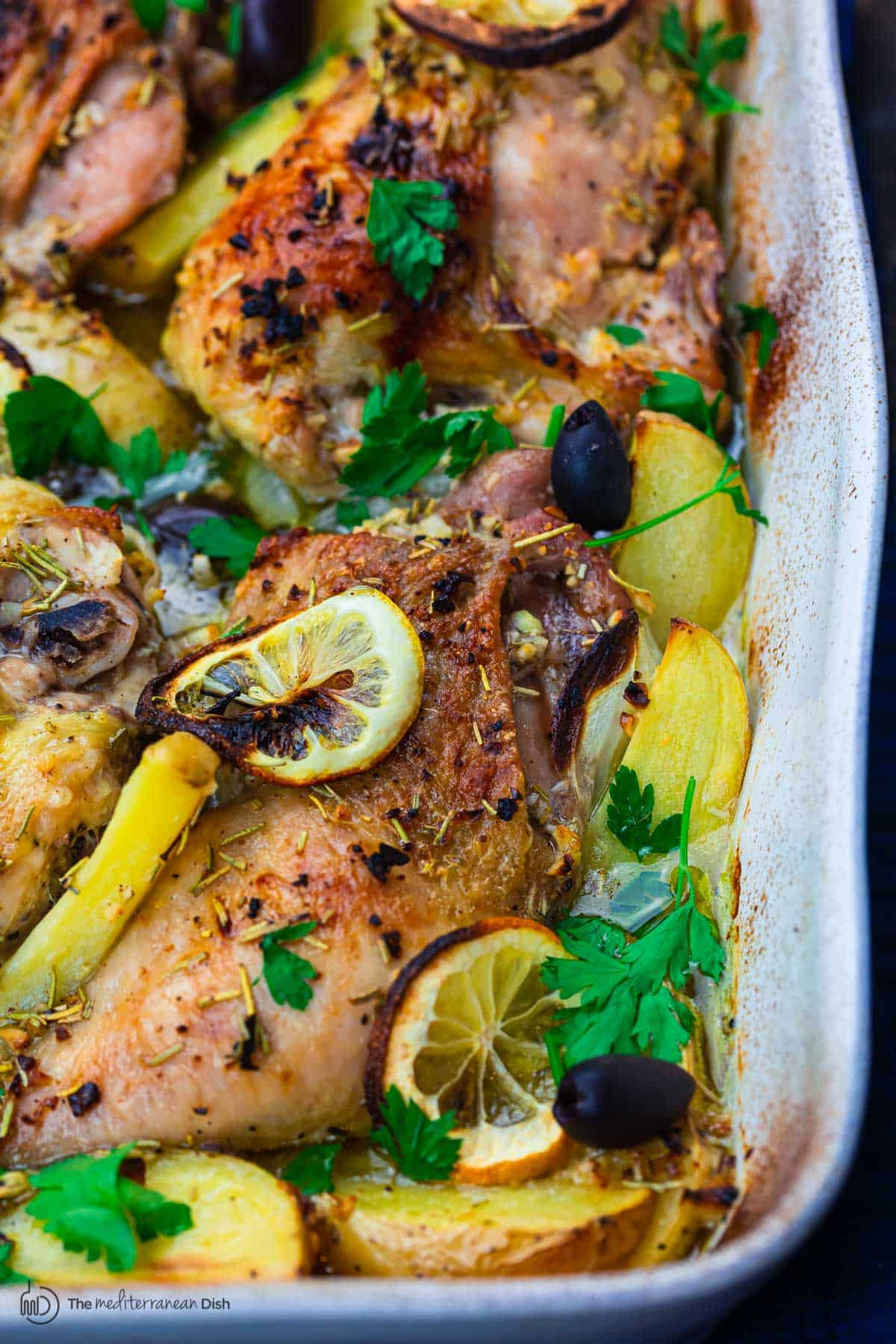 - Bake: Place the uncovered baking dish in the oven for 45 to 60 minutes, until the potatoes are tender and the chicken is cooked through; it should read 165°F on an instant-read thermometer. Depending upon the size of your chicken pieces and potato wedges, you may need an extra 20 minutes. To get more color on the chicken, place the pan under the broiler briefly to allow the chicken skin to gain additional color. Watch carefully so it doesn’t burn. When finished, remove from the oven, add Kalamata olives and fresh parsley.
