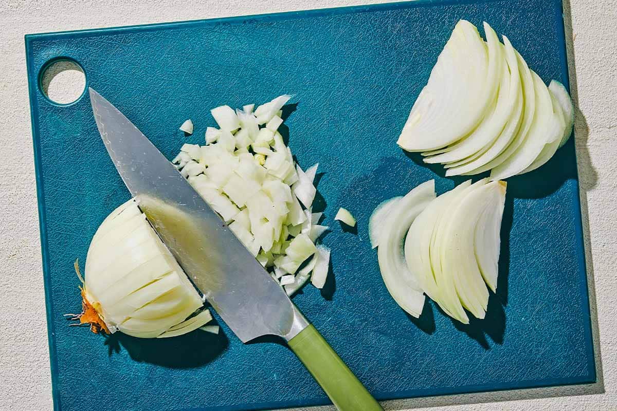 - Prep the onion. Peel and halve the onion. Finely chop one half and set it aside for the meat. Thinly slice the remaining half and reserve separately.
