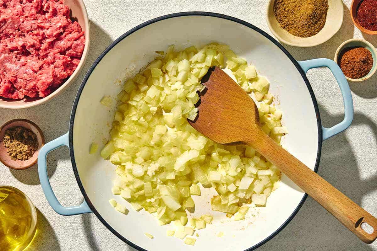 - Cook the beef. Add 1 pound lean ground beef and break it up with a spoon. Cook, stirring occasionally until fully browned, 7 to 10 minutes. Drain excess water or fat (if any). Then season with 1/2 teaspoon ground cumin, 1/2 teaspoon baharat, 1/2 teaspoon ground coriander, 1/4 teaspoon paprika, and a big pinch (about 1/2 teaspoon) each of kosher salt and black pepper. Transfer the meat to a plate and set aside.