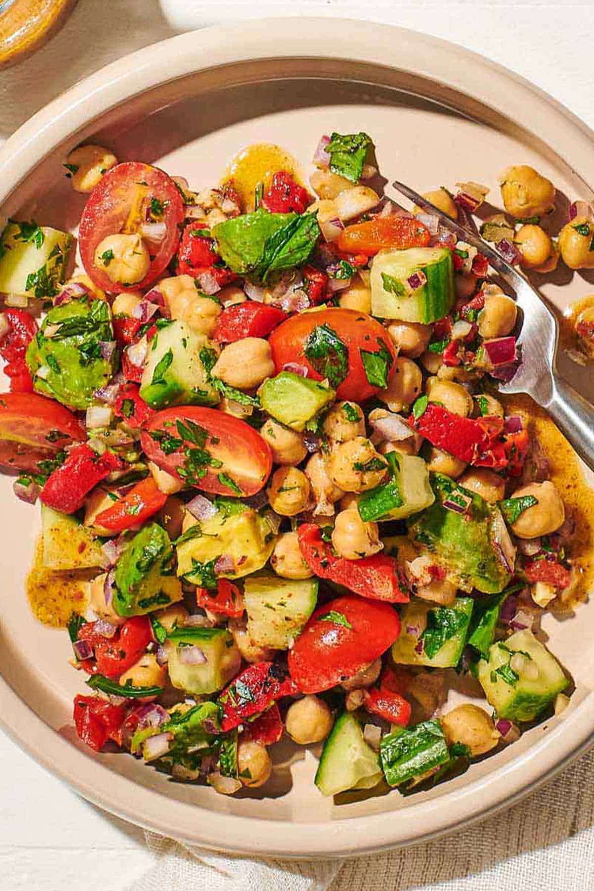 This simple chickpea salad recipe is packed with fresh herbs, juicy grape tomatoes, velvety roasted red peppers, crisp cucumber, and creamy avocado. Delicious and satisfying, thanks to the high plant-based protein and fiber content, it’s excellent on its own or alongside Baked Salmon or Grilled Chicken.