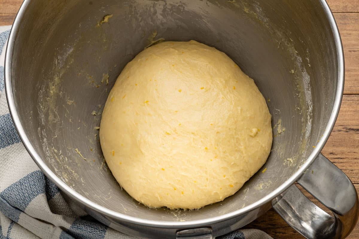 - Make the dough: To the sponge, add the flour, sugar, butter, salt, vanilla, and zest. Fit the mixer with the dough hook attachment, and mix on the lowest speed until the dough comes together into a rough ball, about 1 minute. Increase the speed to level 2 and continue kneading for 7 minutes. The dough should be smooth and elastic and pull away from the sides of the bowl (the dough may still stick to the bottom of the mixing bowl).