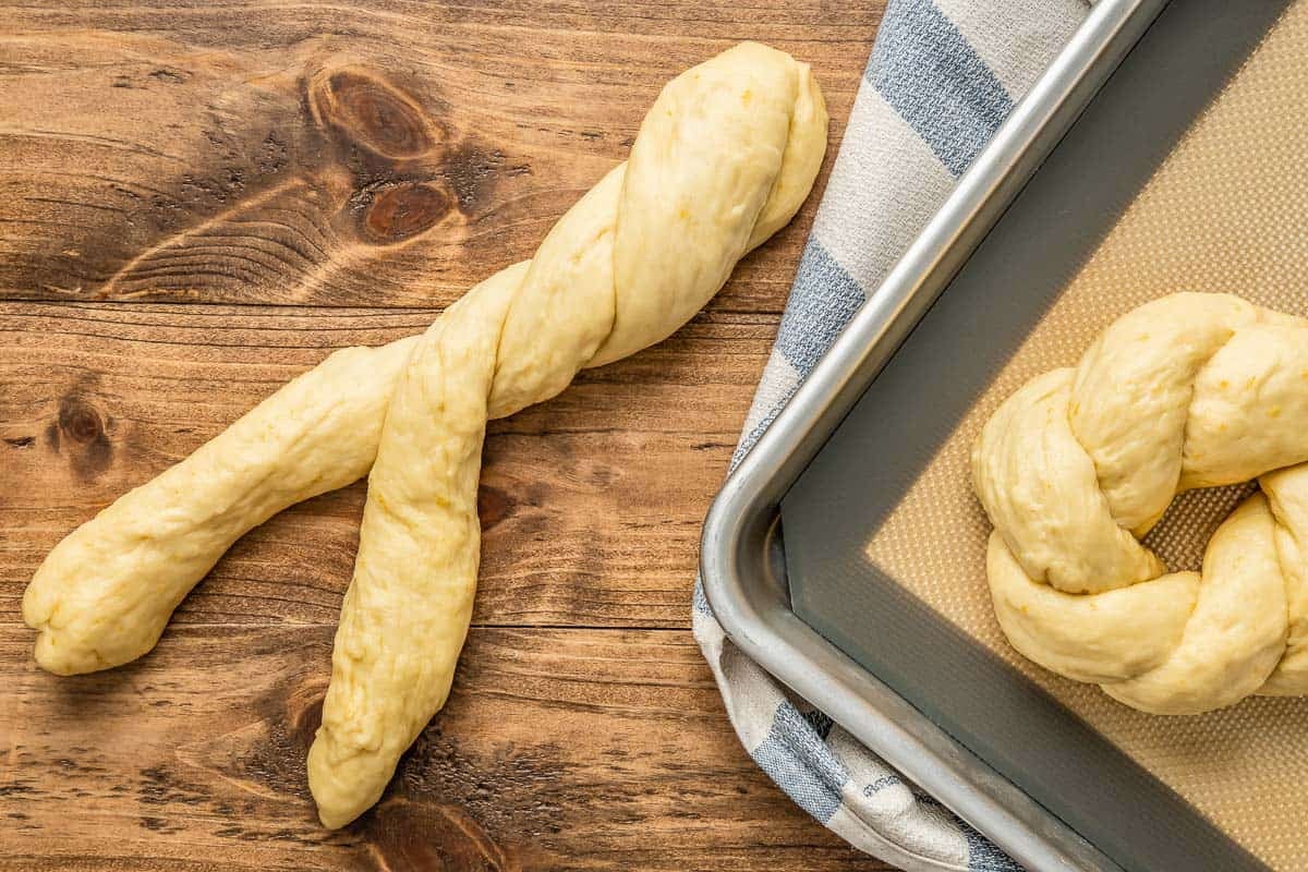 - Assemble the loaves: Line two sheet pans with parchment paper. Use your palms to roll out each piece of dough into a 12-inch rope. Pinch two ropes together at the ends and twist them several times. Pinch the ends together so the twisted rope forms a wreath and tuck the ends underneath. Repeat with the remaining ropes of dough.