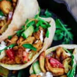 The true Middle Eastern way to serve chicken shawarma is in pita pockets or wraps with heaps of veggies and a good deal of sauce. I like the idea of loaded pita pockets. And for the veggies, peppery arugula and my simple 3-ingredient Mediterranean salad.