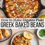 Comforting and buttery gigantes plaki, or Greek giant baked beans, with tomatoes and olive oil make a satisfying vegetarian dinner any night of the week. Or, you can serve them at room temperature over crusty bread as an appetizer!