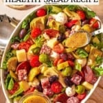This easy antipasto salad recipe turns a classic antipasto platter into a crowd-pleasing appetizer with a mix of charcuterie, Italian pickles, olives, semi-hard cheese, and a bright and peppery Dijon vinaigrette.