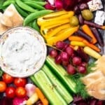 Here is a quick guide for how to assemble a beautiful crudités platter with little effort. This party platter is loaded with vegetables and Mediterranean favorites, it is the perfect make-ahead appetizer for a crowd!