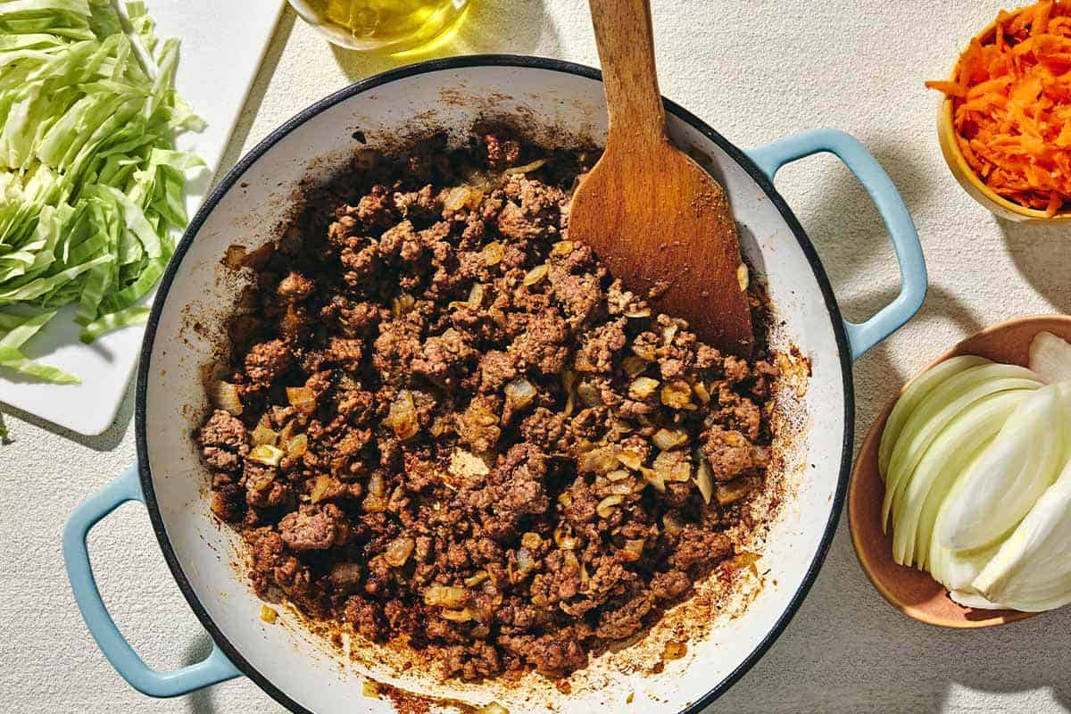 - Cook the beef. Add 1 pound lean ground beef and break it up with a spoon. Cook, stirring occasionally until fully browned, 7 to 10 minutes. Drain excess water or fat (if any). Then season with 1/2 teaspoon ground cumin, 1/2 teaspoon baharat, 1/2 teaspoon ground coriander, 1/4 teaspoon paprika, and a big pinch (about 1/2 teaspoon) each of kosher salt and black pepper. Transfer the meat to a plate and set aside.