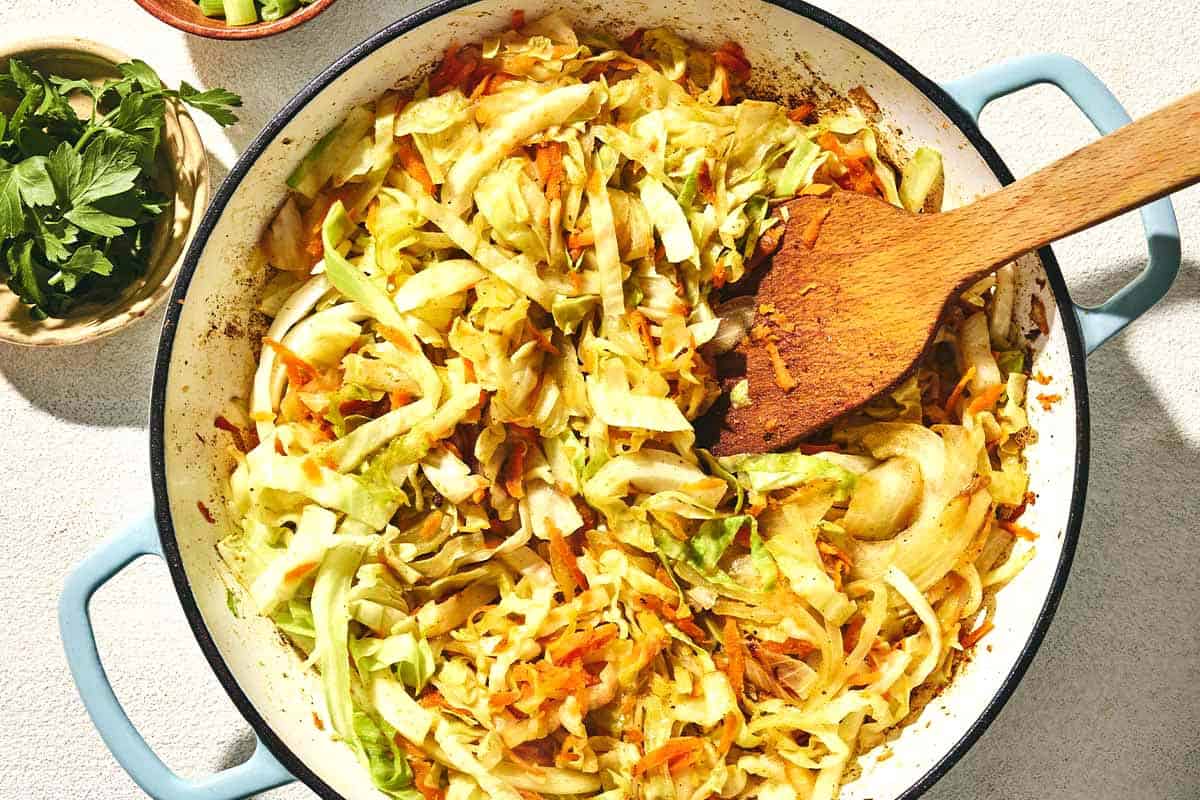 - Sauté, then steam. Return the pan to the stove and heat 2 more tablespoons of olive oil over medium-high heat until it shimmers. Add the sliced onion, 1 small head shredded green cabbage, 3 shredded carrots, the remaining 1/2 teaspoon ground cumin, and a big pinch each of salt and pepper. Toss to coat. Cover the pan for 3 to 5 minutes to help the cabbage release its water and wilt quickly. Uncover and continue cooking, stirring occasionally, until the vegetables are tender and the cabbage is caramelized, about 15 minutes.