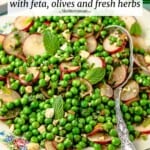 - Finish and serve: Add the sliced radishes and drained peas. Fold in the fresh mint and chives. Crumble feta over the peas. Taste. Add more salt or pepper to your liking. Transfer to a serving bowl or plate. Serve, warm, room temp or cold.