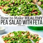 Pea salad should let the peas shine. Let’s skip the mayo this year and make a pea salad that really celebrates the fresh bounty of the season! Nothing says spring like a green pea salad with a few slivers of radish, fresh herbs, and a finishing touch of feta.